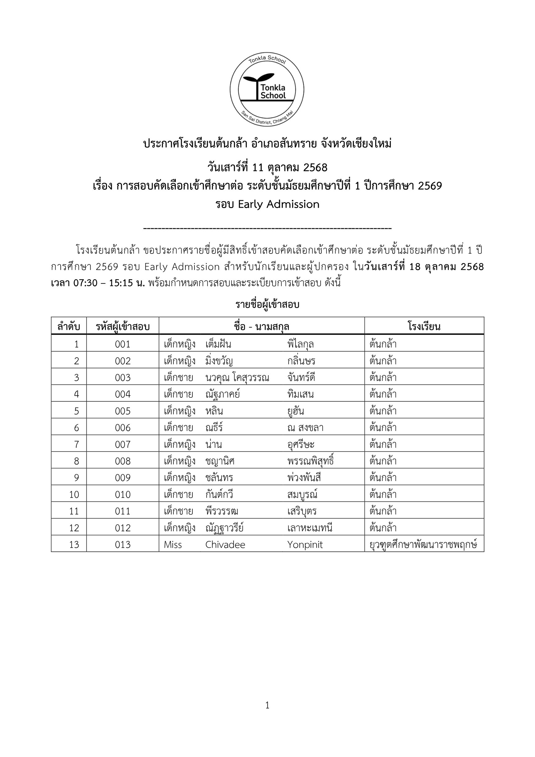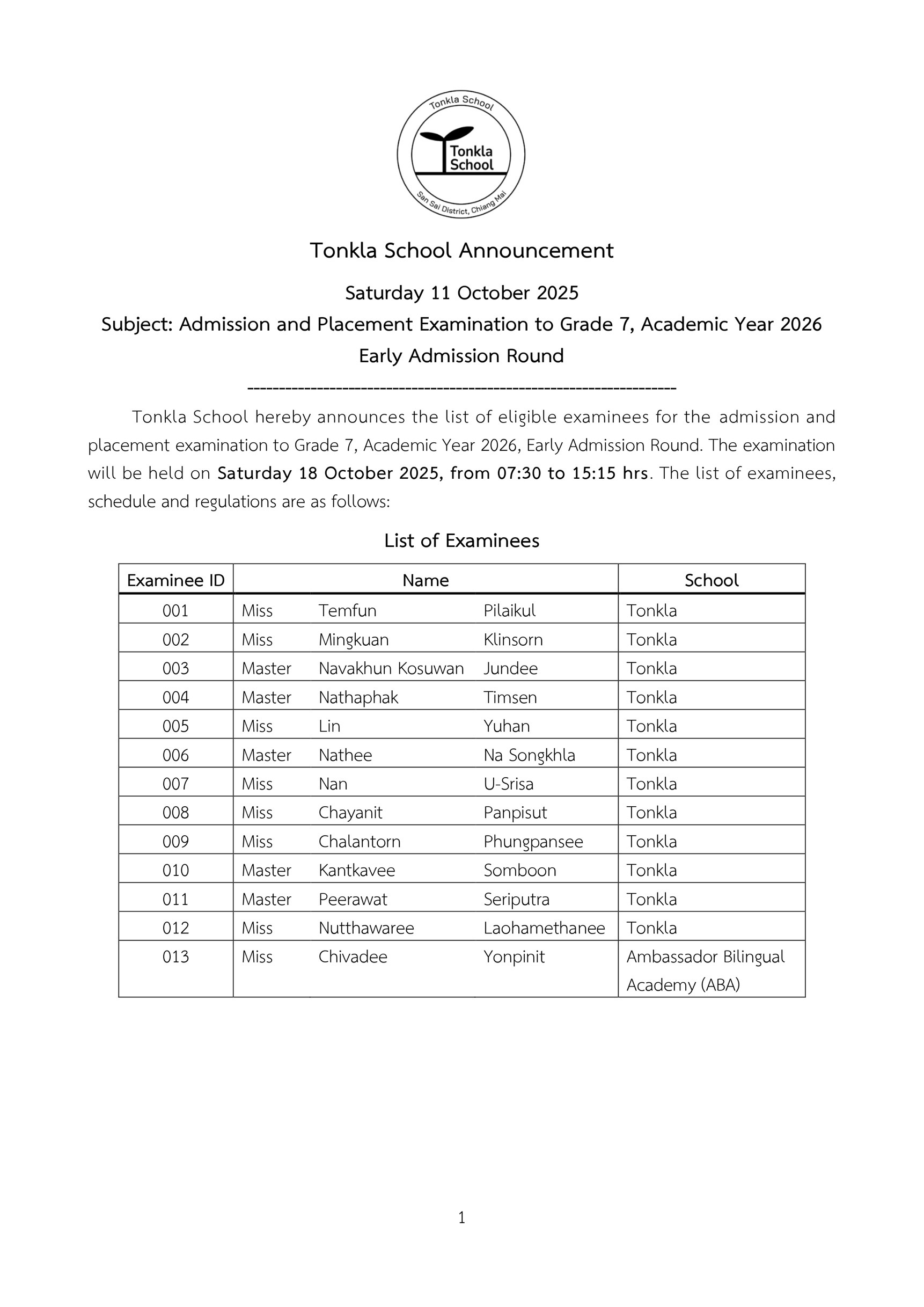 Admission to Grade 7 Academic Year 2026 EarlyAdmission Round – Saturday, 18 October 2025