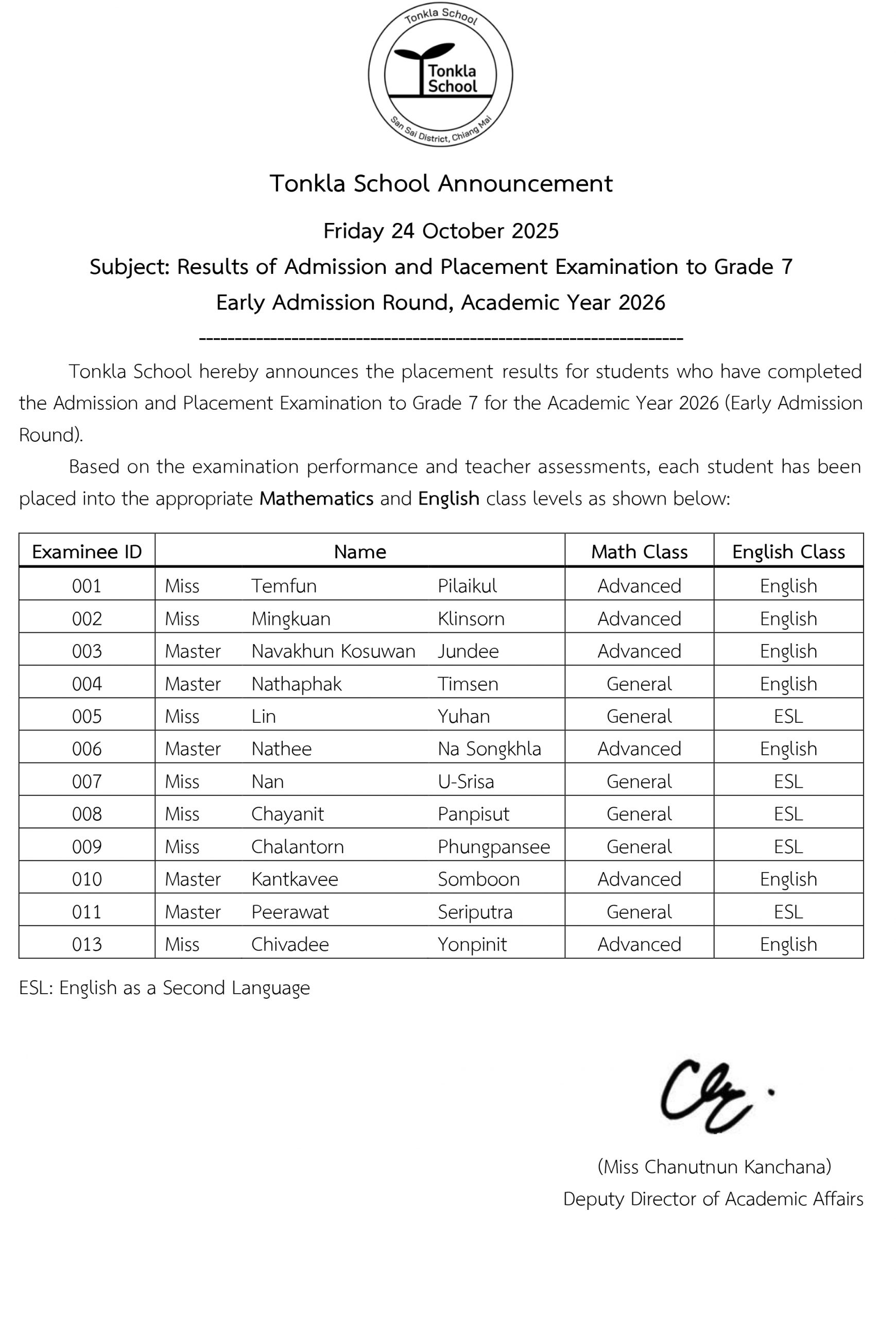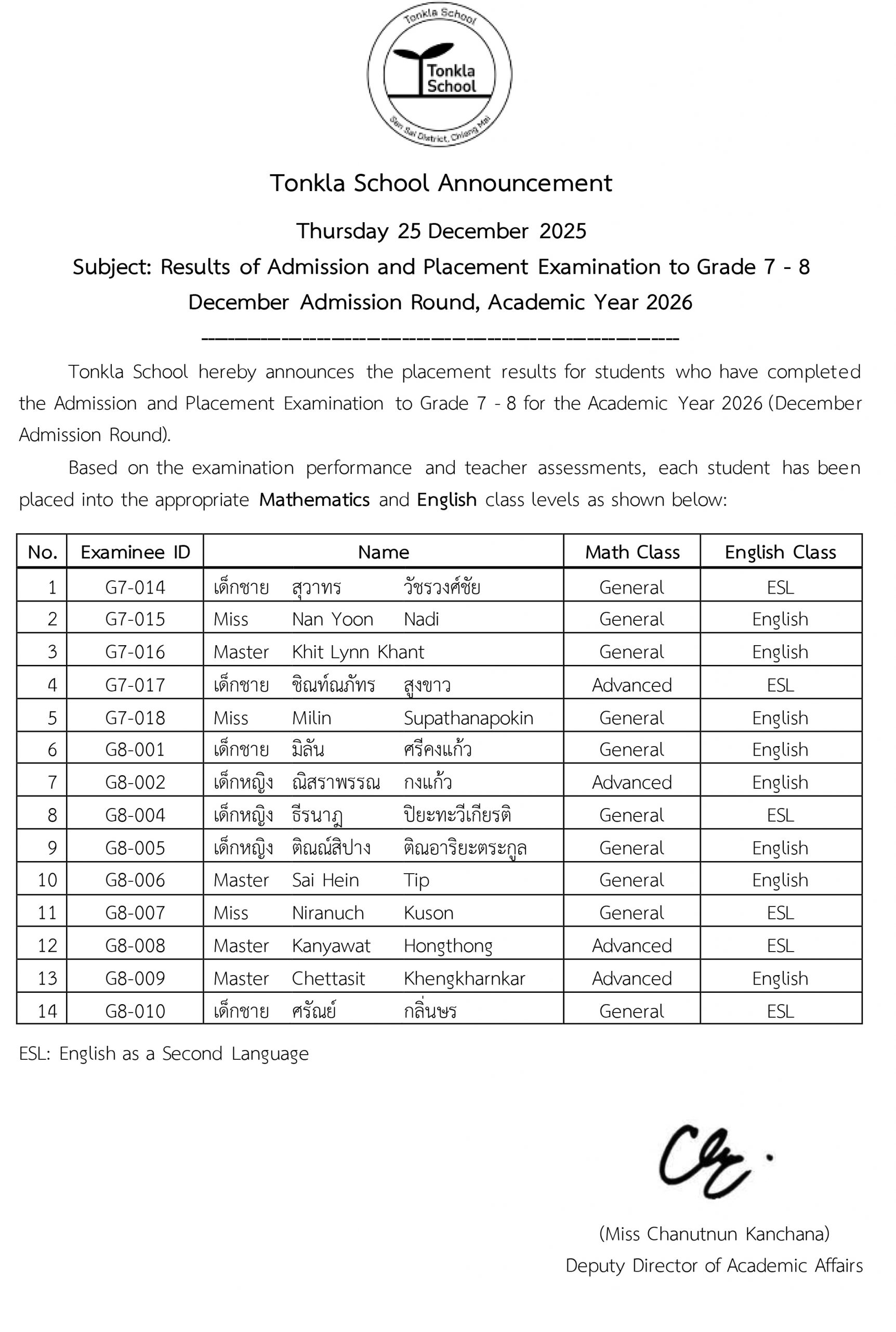 Tonkla School hereby announces the placement results for students who have completed the Admission and Placement Examination to Grade 7 – 8 for the Academic Year 2026 (January Admission Round). Based on the examination performance and teacher assessments, each student has been placed into the appropriate Mathematics and English class levels as shown below: